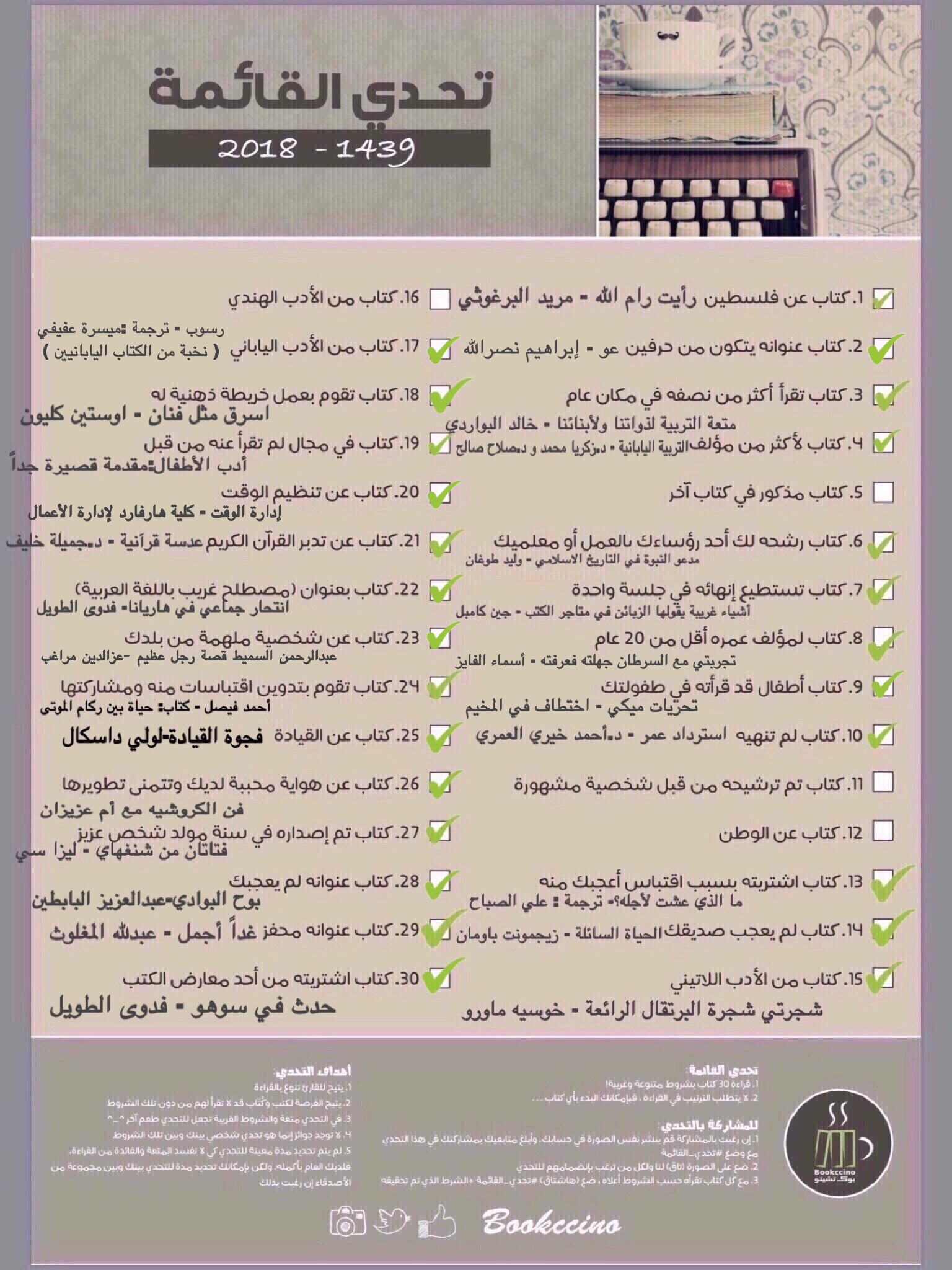 كانت لدي محاولة سابقة عام ٢٠١٧ مع تحدي القائمة ولكن تأخرت بالبدء به و و لم أنجز نصفه … هذا العام تطور كبير إنجاز ٢٦ بند من اصل ٣٠ … خاصةً انني قد حرصت على أن يكون كتاب مختلف لكل بند … حسب ما شاهدته هناك من يقرأ كتاب ينطبق عليه بندين مثلاَ من البنود … استمتعت جداً بهذه التشكيلة من مواصفات الكتب و حقيقةً التحدي أضاف لي الكثير هذا العام و هذه بعض الكنوز و الغنائم من التجربة