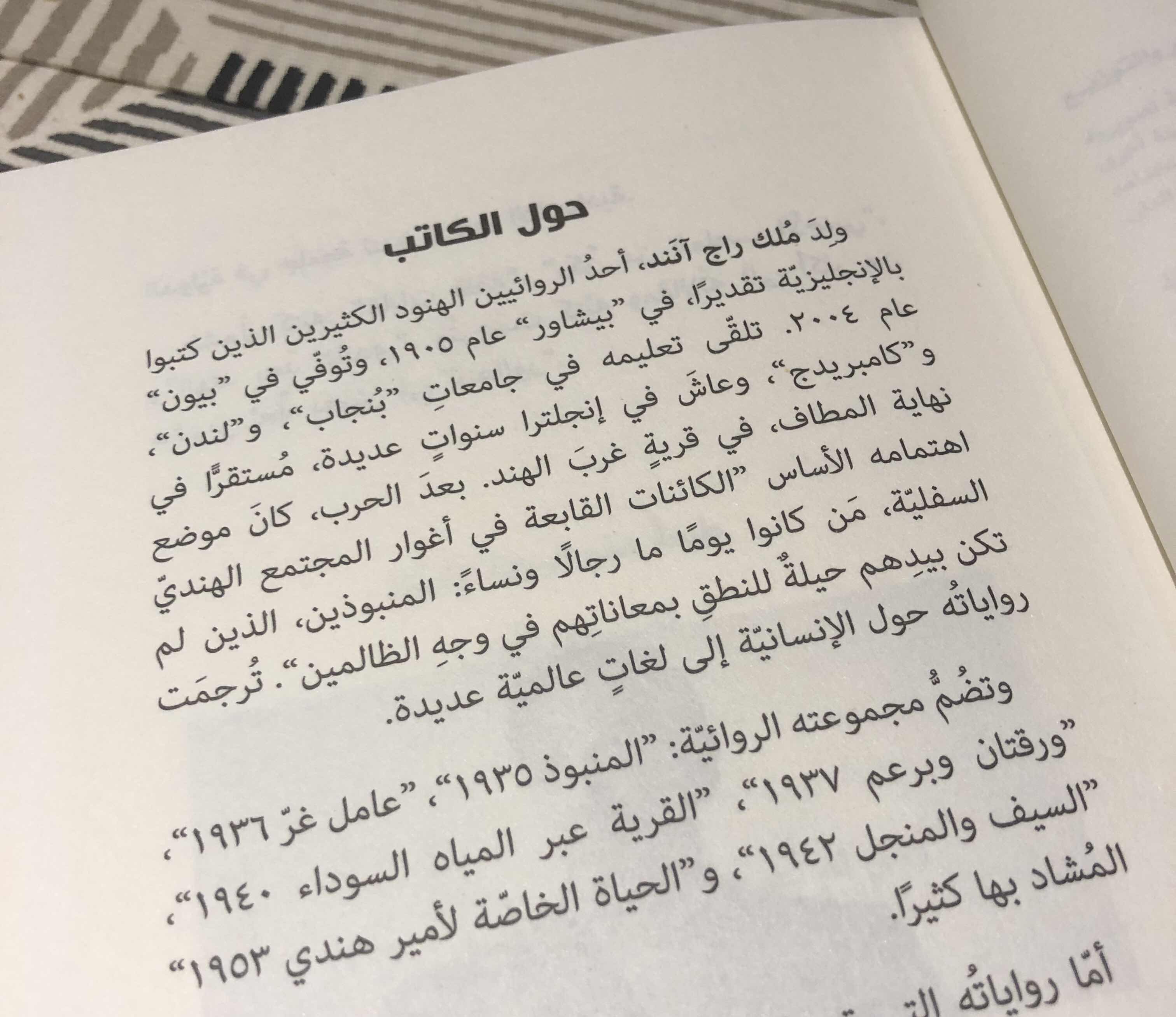 الرواية تبدأ بتعريف بسيط بالكاتب : ملك راج آنند و بكاتب المقدمة راماشاندرا كوها