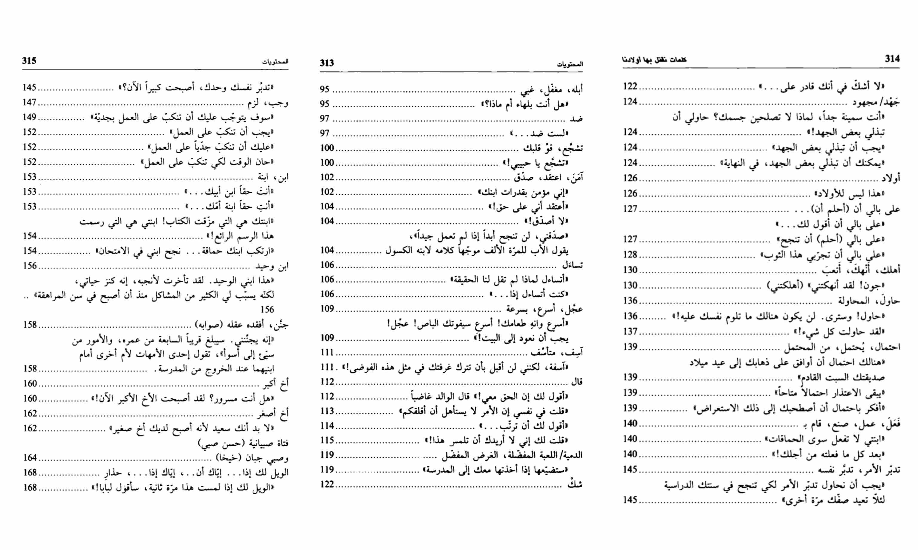 لم أود أرفق بالفهرس كاملاً ولكنني لم استطع أن اختار ماذا أعطي كمثال فجميع ما ذُكِر مهم جداً لأخذ تصور عن الكتاب .. أعتقدت بالبدء وربما بسبب الغلاف إن المقصود بالكلمات للأبناء فقط بمرحلة الطفولة المبكرة أو لمرحلة المراهقة مثلاً لكن العديد من العبارات كانت تتعلق حتى بمرحلة ما بعد الجامعة وأثر هذه العبارة وتلك على الابن خاصةً لأنها تصدر من والديه و كل كلمة أو عبارة لماذا يجب تجنبها؟ ماهو الانطباع الذي تعطيه للابن هذه العبارة؟ وما البديل ؟