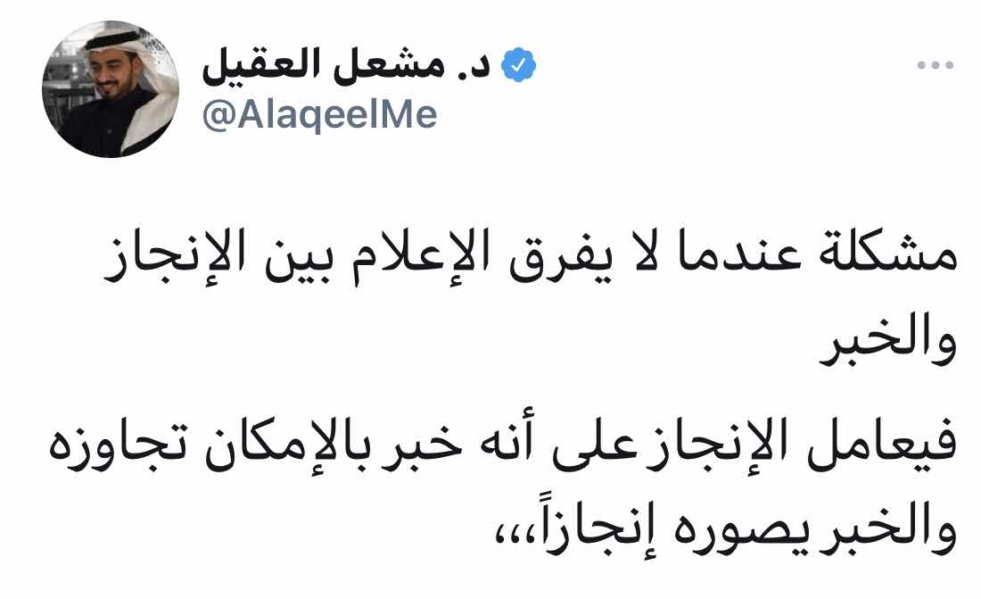 وهذه تغريدة من د.مشعل العقيل استوقفتني وذكرتني بمحتوى الكتاب ويبدو أن مفهوم الإنجاز يختلط مثلما ذكرنا على المستوى الاعلامي أيضًا وليس فقط على المستوى الشخصي